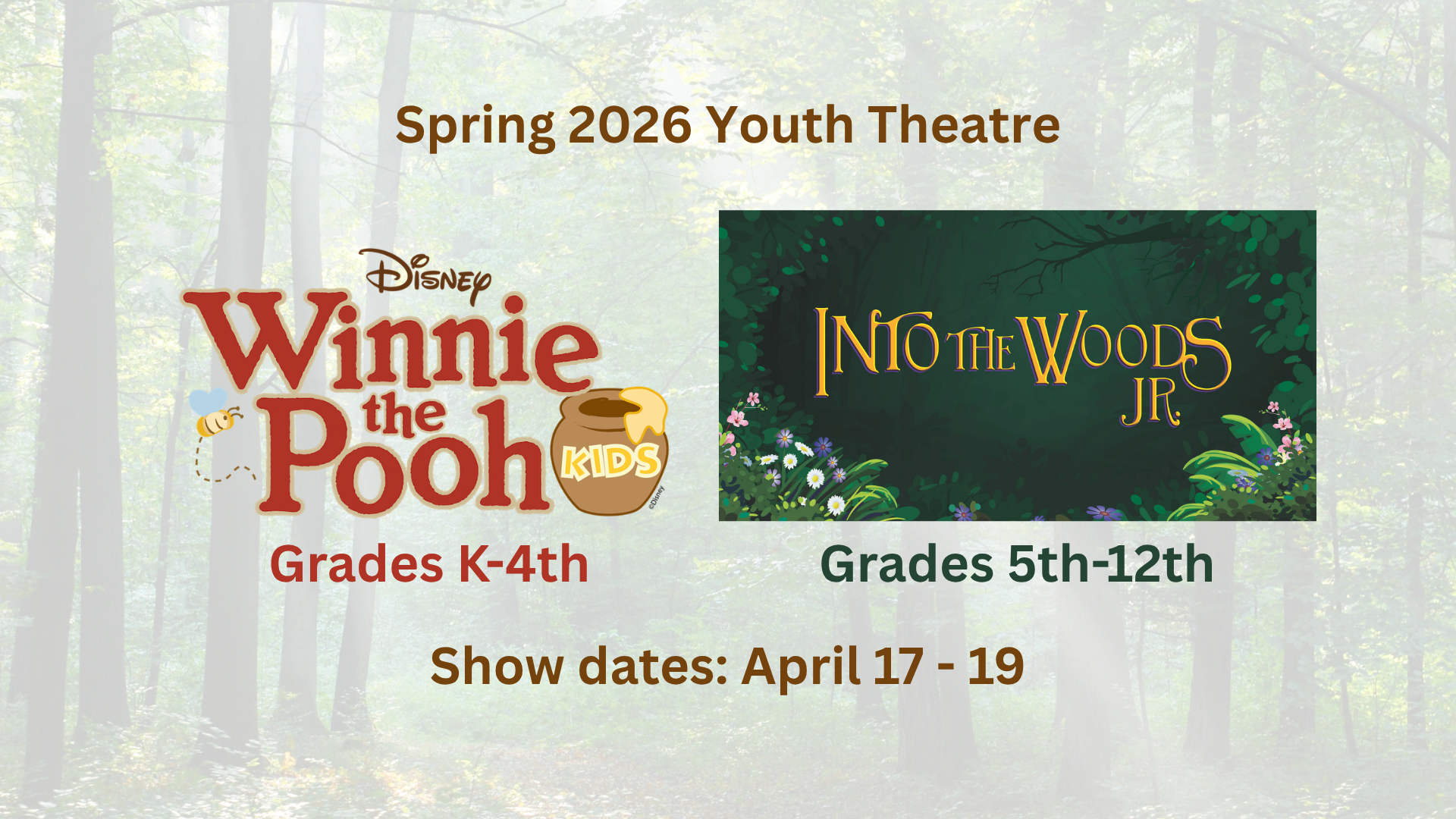 11/13/2025 1920 × 1080 🐻🌳 Coming Spring 2026 to Town Theatre! Our youngest performers (grades K–4) will bring the Hundred Acre Wood to life in Winnie the Pooh Kids, while our older students (grades 5–12) take the stag (2)